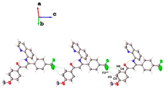 Lastly, the crystal structure of SB3, as described for SB1, is stabilized mainly by π–π intermolecular interactions between the quinolinic aromatic fragments; however, in this case, each aromatic ring plane presents only one π interaction. The interaction observed occurs between the planes (-C12-N3-C14-C15-C16-) and (-C11-C12-C16-C17-C18-C19-)vii of quinoline moieties of adjacent molecules. Compared to what is observed for SB1 and SB2, this interaction shows the shortest centroid–centroid and shift distances of 3.648 Å and 1.076 Å, respectively. Overlapping of the quinoline fragments of neighboring molecules, as observed for SB1 (Figure 6), favors a weak intermolecular interaction C15-H15···O2vii of 3.350 Å between the same molecules. In addition, intermolecular hydrogen bond interactions C6-H6···F3viii and C5-H5···F3Aviii of 3.49 and 3.29 Å are observed. These interactions grow along the c-axis and result in a molecular arrangement with alternating donor and acceptor substituents (Figure 6). The packing is completed with C25-H25···O2ix and C25-H25···N2ix between hydrogen atoms in the aromatic ring bonded to the acceptor moiety and an oxygen atom in the main molecular skeleton (3.354 Å) and a nitrogen atom in the quinolinic aromatic moiety (3.370 Å). Finally, an intermolecular hydrogen bond C24-H24···F1Ax of 3.498 Å is observed (Figure S15).