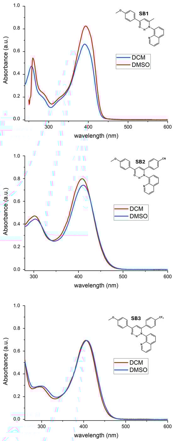 UV-vis spectra of the Schiff base compounds SB1–SB3 (from top to bottom) recorded in dichloromethane (red line) and DMSO (blue line). Solutions at 20 °C.