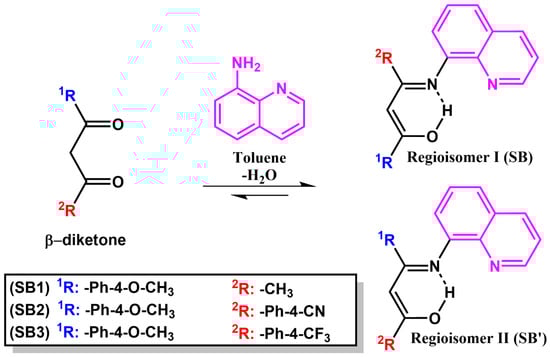 The Schiff base derivative SB1 was formed as a single regioisomer, resulting from condensation taking place at the least impeded carbonyl functionality, which is the one nearest to the methyl group of the β-diketonic skeleton of β1. This follows the general trend observed for Schiff condensation of monosubstituted 1-R-1,3-butadione (R = organic or organometallic moieties) with primary amines [8,9,26,27,28]. The synthesis of compounds SB2 and SB3, derived from Schiff condensation between the dipolar 1,3-diketones β2 (MeO/CN) and β3 (MeO/CF3) and 8-aminoquinoline, resulted in the formation of regioisomer mixtures SB2/SB2′ and SB3/SB3′, respectively, due to the addition of 8-aminoquinoline to one or the other carbonyl group of the diketone (Scheme 1).