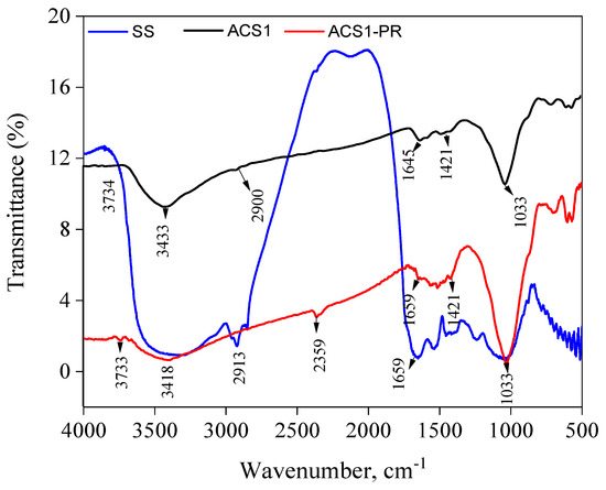 The surface chemistry of activated carbon (ACS1 and ACS2) and sludge from wastewater (SS) obtained through penetration with KOH have been assessed employing FT-IR (Figure 1 and Figure 2 and Table 2). It was theorized that there are functional groups of compounds such as lactones, phenols, anhydrides, aldehydes, ketones and quinones. The acid-base composition of the activated carbon is influenced by these functional groups [30,31]. Sludge from sewage systems contains a lot of functional groups, especially from the volatile components. Si-OH compounds and physically adsorbed water molecules are associated with a broader band between 4000 and 3700 cm−1 [32]. Structures containing hydroxyl groups include alcohols, carboxyl structures and phenols. OH was the symbol of the carboxyl group, the key absorption band between 3800 and 2500 cm−1 represents it [33]. The peak at 1410 cm−1 is prompted by the phenolic OH groups. The degradation of the phenolic structures causes this peak to disappear at high temperatures. The peak positions of 2919 and 2850 cm−1 are aliphatic C–H peaks. The peak at 1036 cm−1 [34] indicates the C–C bond. The NH groups were the result of vibrational motions, as shown by the peak at 1541 cm−1. These properties lead to a structure that is rich in functional groups such as those found in sewage sludge. The activated carbon spectrum shows two remarkable peaks, 3410 and 1028 cm−1 respectively, indicating the presence of OH and C–O groups (Figure 1). The signal at 3383 cm−1 indicates the presence of hydroxyl groups in the KOH-impregnated activated carbon structure, while the peak at 1633 cm−1 indicates the synthesis of carbonates [35,36]. The structures of sewage sludge and activated carbon show 1410 and 1418 cm−1 peaks, respectively, indicating that the phenolic OH groups are still degrading. Peaks can be seen in the region of fingerprints at 605 and 440 cm−1 indicating the presence of mono-substituted aromatic compounds. Figure 2 displays the PR spectra and PR in combination with activated carbon (ACS1-PR, ACS2-PR). The PR spectra showed that the sulfonate group is stretched at 1480 cm−1. However, in the spectra of activated carbon bound to PR, this band is not visible at all. Meanwhile, a clear stretching of the OH group in PR was observed at 3293 cm−1. A second broadband with a core at 3429 cm−1 formed later when this band disappeared. This shows that PR, like other anchoring groups, can adhere to activated carbon surfaces.