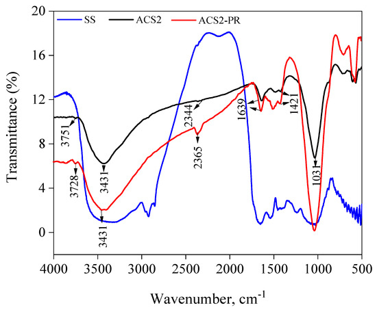 FT-IR spectra of unthicken sewage sludge (SS), Activated carbon (ACS2) and Activated carbon (ACS2-PR) after absorption PR.