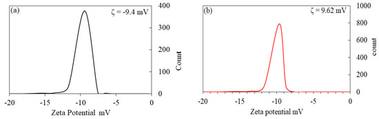 The particle size distribution and surface zeta potential of ACS1 and ACS2 in an aqueous colloidal solution were determined using the Dynamic Light Scattering (DLS) technique. This method allowed for the measurement of both nanoparticle size and surface charge. The findings showed a negative zeta potential of −9.4 mV for ACS1 and −9.62 mV for ACS2, as illustrated in Figure 4a,b, indicated a strong force of repulsion between negatively charged particles and well able to adsorb positively charged pollutants.