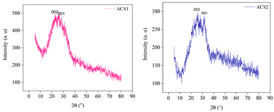 ACS1 and ACS2 were analyzed by XRD, as shown in Figure 5. The results show that ACS1 and ACS2 have large diffraction peaks at 2θ = 28.48° to 30.89 and 26.08° 31.8°, respectively. These peaks are similar to the typical peaks for carbon substance (002) and graphite surface (100) [38,39]. The mean crystallite size t of the ACS1 and ACS2 was calculated to be 20.72–13.30 and 6.20–7.34 nm, respectively, as shown in Table 4.