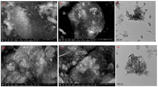 Figure 6 shows the physical morphology of ACS1 and ACS2. The graph shows a significant change in morphology, especially in size and pores. The SEM images of ACS1 (Figure 6a,b) and ACS2 (Figure 6d,e) show broad outer surfaces with considerable porosity. This is particularly successful in the removal of pollutants from water by adsorption techniques. In the high-resolution TEM image of ACS1 (Figure 6c) and ACS2 (Figure 6f), the disordered and porous structure of the carbon flakes can be seen. The distribution of particle sizes is 20.72–13.30 nm for ACS1 and 6.20–7.34 nm for ACS2. This is consistent with the results of the XRD investigation. The surface area of ACS1 and ACS2 is increased by these irregularly sized pores, which also leads to an improvement in efficiency and adsorption capacity.