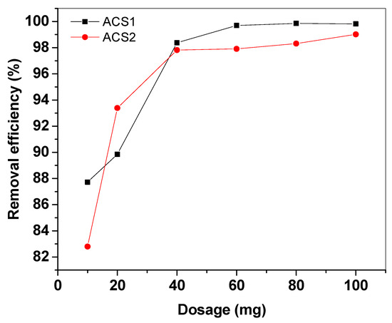 To investigate the change in adsorption as a function of the amount of adsorbent, different doses of ACS1 and ACS2 from 0.01 g to 0.1 g were added to 25 mL volumetric flasks containing 0.1 g of the PR dye and pH = 7. The study was carried out at 30 °C. Increasing the mass of ACS1 and ACS2 from 0.01 g to 0.1 g resulted in an increase in the adsorbed percentage from 87% and 82.8% to 99.8% and 99.01% for PR dye, respectively. It was observed that the adsorption increased with increasing amount of adsorbent (Figure 7). This trend is largely related to the fact that as the amount of adsorbent increases, the adsorptive surface area also increases, providing a greater number of active sites for adsorption [47].