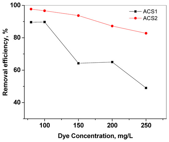 The effect of initial dye concentration on dye removal efficiency was investigated in a wide range of PR dye concentrations (80 to 250 mg/L), keeping the optimal dose of ACS1 and ACS2 adsorbents (40 mg) and the solution volume at 25 mL. Adsorption at 30 °C decreased for both ACS1 and ACS2 as the dye concentration increased (Figure 8). The removal efficiency for 80 mg PR is 89.5% and 97.6% with ACS1 and ACS2, respectively, but for 250 mg PR, the removal efficiency is 49.0% and 82.77% with ACS1 and ACS2, respectively. As the concentration of the dye solution increases, the adsorption sites become saturated and prevent further adsorption of the PR dye molecules at all temperatures [48].