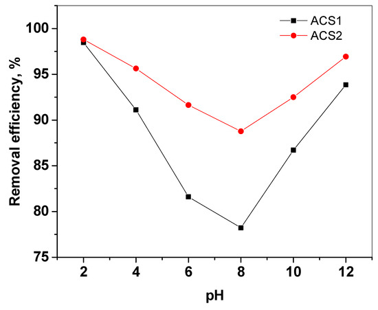 Effect of pH on the removal efficiency of PR dye by ACS1 and ACS2 at 30 °C, initial concentration; 100 mg, adsorbent dose; 40 mg.