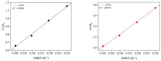 Van’t Hoff plot for the adsorption of phenol red ACS1 and ACS2 at different temperatures.