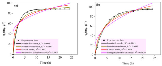 Fitting results of adsorption kinetic model for adsorption of PR onto ACS1 (a) and ACS2 (b).