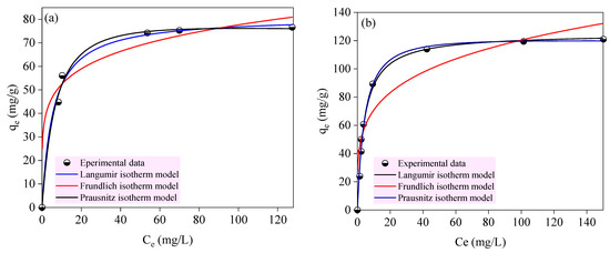 The adsorption isotherms of the two activated carbons ACS1 and ACS2 were calculated using initial concentrations of phenol red between 10 and 250 mg/L. The adsorption isotherm models of Langmuir, the experimental data were analyzed using the Freundlich and Prausnitz–Radke Equations (4)–(6). The adsorption process and the definition of the adsorption mechanism and type are simplified by these models, which are the most used isothermal adsorption models: