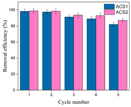 The ability of sorbents to undergo several regeneration cycles is of great economic importance due to their influence on production costs. The PR loaded with ACS1 and ACS2 was shaken in ethyl alcohol for five hours, rinsed with ethyl alcohol and heated at 50 °C for five hours (heat desorption in a steamed oven), and the recovery of the adsorbents ACS1 and ACS2 was examined. As shown in Figure 13, ACS1 and ACS2 adsorbents exhibited persistently high affinity and maintained efficient PR removal of over 82.12% and 87.00% for ACS1 and ACS2, respectively, even after five consecutive regeneration cycles. These results highlight the efficacy and recyclability of synthetic ACS1 and ACS2 as PR adsorbents and emphasize their economic viability for repeated use.
