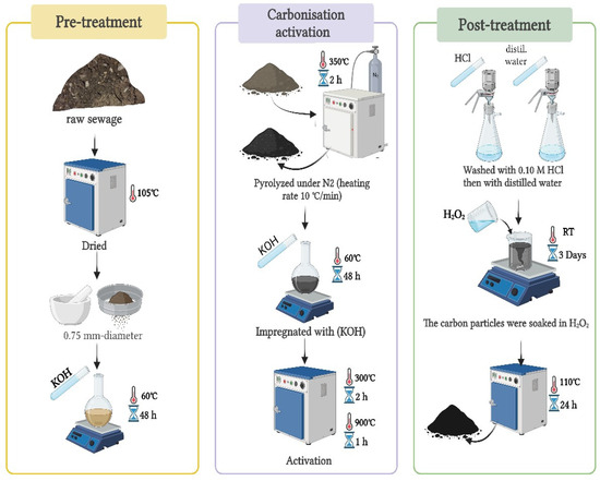 The two forms of raw sludge used to produce activated carbons are thickened samples (ACS1) and un-thickened samples (ACS2). In this process, raw sewage sludge is removed from a dry bed at a wastewater treatment plant in Bisha, in the Asir region of southwest Saudi Arabia. Figure 14 depicts the synthesis of activated carbon ACS1 and ACS2.