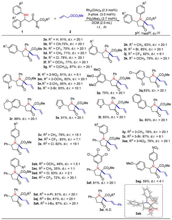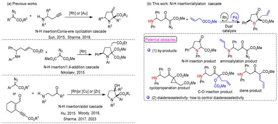 The reaction comprises several active intermediates, including metallocarbenes, ammonium ylides, and allyl cations. As a result, several byproducts may form from these intermediates: an N−H insertion product resulting from a 1,2-H shift of ammonium ylides [40,41,42], metalcarbenes cyclopropylation product [43], a product resulting from allylic ester C−O bond insertion into a diazo compound [44], amine allylation product of diazo compound [45]. and diene product [46]. In addition, two stereocenters will be generated during the reaction process, and how to obtain the target product with high diastereoselectivity is also a challenge that needs to be overcome in this study. Therefore, achieving selective formation of highly functionalized and polysubstituted pyrrolidines with high chemoselectivity and diastereoselectivity through the Rh/Pd dual-catalyzed cascade process involving N–H insertion/allylation is a formidable challenge. Herein, we report our efforts to address above issues and obtain the highly functionalized and polysubstituted pyrrolidines with high diastereoselectivity, high chemoselectivity, and broad substrate scope under mild reaction conditions (Figure 2b).