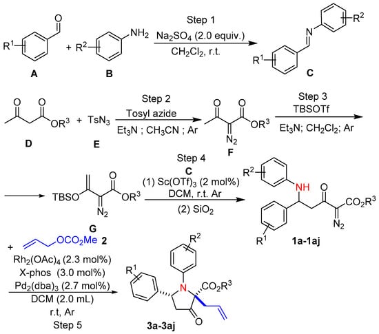 - Medvedev, J.J.; Galkina, O.S.; Klinkova, A.A.; Giera, D.S.; Hennig, L.; Schneider, C.; Nikolaev, V.A. Domino [4 +,β-unsaturated δ-amino esters with Rh(ii)–carbenoids—A new approach towards multi-functionalized N-aryl pyrrolidines. Org. Biomol. Chem. 2015, 13, 2640–2651. [Google Scholar] [CrossRef]