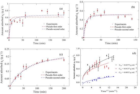 Results of adsorption kinetics of tequila vinasses compounds on the MaMPT002 adsorbent at three different initial conditions and fitting to three kinetic models. (a) Co = 0.0275 g mL−1, (b) Co = 0.0137 g mL−1, (c) Co = 0.0052 g mL−1, (d) IPD model; symbols are experimental data, continuous lines are IPD model predictions.
