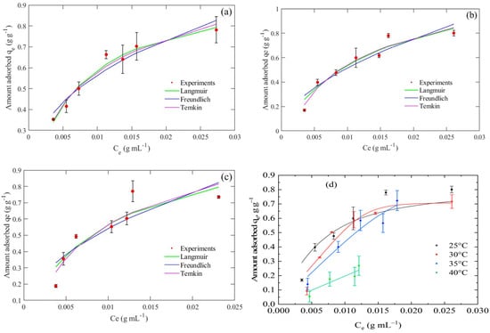 Experimental adsorption isotherms of tequila vinasses on the MaMPT002 adsorbent and simulations using three common isotherm models at three different pH values. (a) pH = 3.0, (b) pH 03.55, (c) pH = 4.0. (d) Effect of temperature on tequila vinasses uptake on the MaMPT002 adsorbent at three different temperatures.