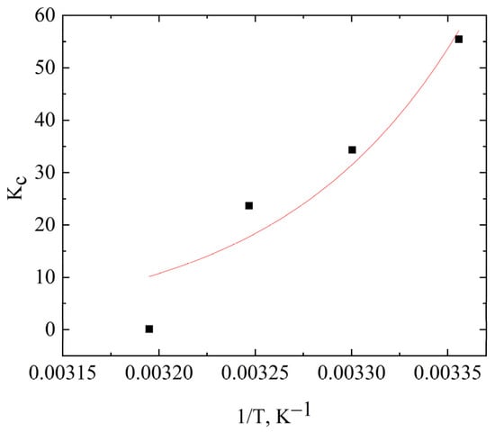 Kc as a function of the inverse of temperature and the non-linear fitting to Equation (4).