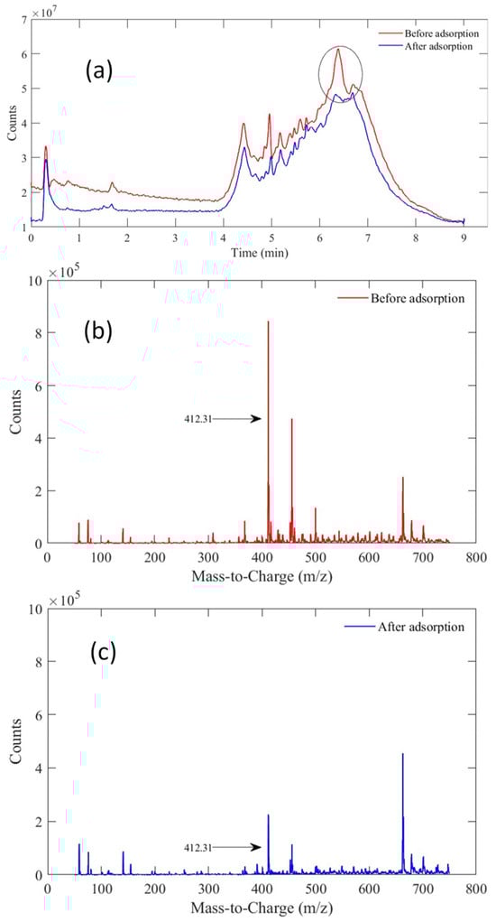 Selectivity results of tequila vinasses adsorption on the MaMPTS002 adsorbent. (a) HPLC chromatograms before and after adsorption; (b) mass spectrum before adsorption; (c) mass spectrum after adsorption.