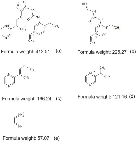 Chromatograms in Figure 4 indicate a significant intensity decrease in a peak at a time of ~6.4 min after adsorption (indicated by the circle in this figure). This is indicative of the adsorption of compounds present in the tequila vinasses. The mass spectra of Figure 4 indicate a significant decrease in the intensity of most of the signals after adsorption (Figure 4c), except for the signal at ~680 m/z. This is because the mass spectrometer does not use a standard, but instead it uses the most abundant molecule or fragment as a reference, and the intensity scale is organized around the most abundant fragment with respect to the rest of the fragments. This suggests that the adsorbent shows little selectivity for these molecules. It is worth noting that the complexity of the sample and the large variety of possible molecules corresponding to these masses limit the presentation of one proposal only based on their fragmentations and reported structures. The mass spectrum of Figure 4b shows that the peak of the chromatogram at ~6.4 min corresponds to molecules of 412.31 m/z. The removal of these molecules is further confirmed by a signal decrease in the mass spectrum after adsorption (Figure 4c). On the other hand, to gain insights about the identity of the molecules being adsorbed, the fragmentation pattern corresponding to the molecules with 412.31 m/z was used (Table 6). The fragments with a greater probability of coinciding with this mass are shown in Figure 5. According to the results of the software Optimizer, the mass of 412.31 coincides with a type of molecule called melanoidin. This proposal is based on reports by Hofman and Schieberle [15], which included melanoidin structures capable of interacting with thiol groups. Melanoidins are compounds generated by the Maillard reaction which grants a dark brown color to tequila vinasses. Melanoidins show high chelation capacities toward different metal ions and organic compounds. This poses an environmental problem since these properties make them hazardous when discharged to water bodies and fertile lands because they can chelate metallic ions needed for the flora and fauna of the ecosystem.
