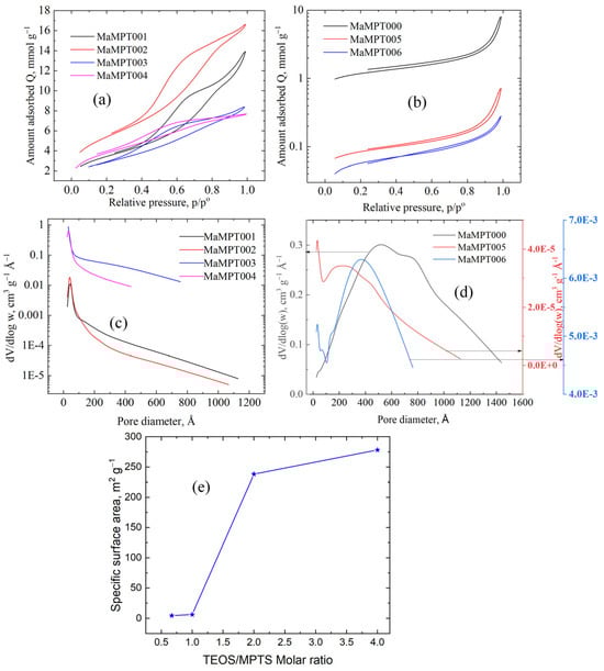 Nitrogen adsorption isotherms and pore size distributions of synthesized adsorbents. (a) Isotherms of samples MaMPT001 through MaMPT004; (b) isotherms of samples MaMPT000, MaMPT005, and MaMPT006; (c) pore size distributions of samples MaMPT001 through MaMPT004; (d) pore size distributions of samples MaMPT000, MaMPT005, and MaMPT00, (e) TEOS:MPTS molar ratio effect on specific surface area.