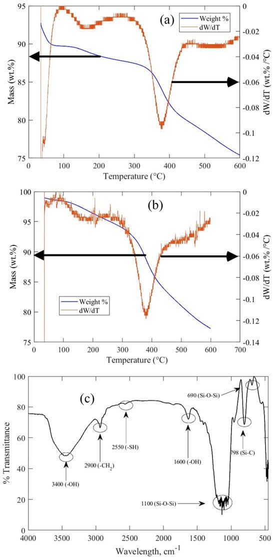Figure 7c depicts the results of the FTIR analysis of the MaMPT002 adsorbent. Two bands appear at 3400 cm−1 and 1600 cm−1 and correspond to the stretching and bending of the -OH groups of silanol groups and adsorbed H2O, respectively. The signal at 1100 cm−1 is due to the stretching vibration of siloxane groups Si-O-Si present in the silica matrix. The bands at 2900, 1400, and 690 cm−1 correspond to asymmetric stretching, scissoring movement, and bending of the methylene group CH2, respectively, of the MPTS molecule. A signal appears at 798 cm−1 corresponding to the Si-C bonds. The functional thiol group (S-H) presents a weak stretching vibration signal at 2550 cm−1, and finally, the signal observed at 798 cm−1 corresponds to the Si-C bonds.