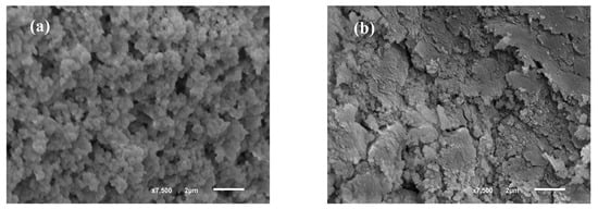 SEM results of (a) tequila vinasses-free MaMPT002 adsorbent, and (b) MaMPT002 adsorbent after tequila vinasses adsorption.