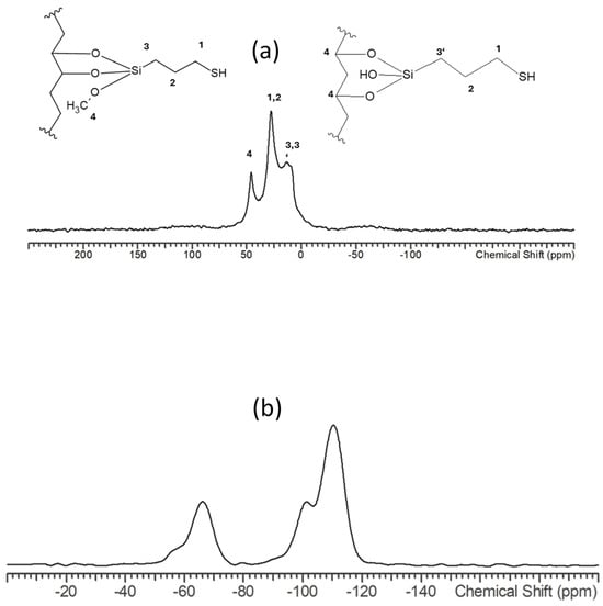 The propyl thiol-grafted moieties, and the silicon species attached and composing the silica matrix of the MaMPT002 adsorbent, were measured by 13C and 29Si solid–state NMR spectroscopy, respectively, as shown in Figure 9. In Figure 9a the zone around 12 ppm depicts a broadened signal of two overlapping peaks associated with the carbon C-3 which presents different chemical environments to those of the ligand. Carbons C-1 and C-2 of the MPTS chain are identified by a signal at 28 ppm, and the one corresponding to carbon C-4 of the unreacted and non-hydrolyzed methoxyl groups and present on the matrix silica surface, appears at 45 ppm [18]. On the other hand, in the case of the 29Si spectrum (Figure 9b), two main regions of the spectrum are clearly identified, one at −111 ppm and the other one at −63 ppm which correspond, in general, to the Qm and Tm species. Particularly, the signals shown in the zone of −111 ppm correspond to the Q4 species, and the one at −101 ppm is attributed to a Q3 species [18]. This last signal confirms the presence of free silanol groups, SiOH. In addition, the absence of signals at −92 ppm demonstrates the absence of geminal silanols (Si (OH)2) in the adsorbent. Additionally, the signals located at −65 ppm correspond to the T3 species, whereas the signal at −57 ppm is assigned to the T2 species. These results confirm the presence of the ligand groups MPTS to the silica matrix either by two or three covalent bonds, as shown in the schemes of Figure 8a. Furthermore, these results demonstrate that the surface density of the thiol functional groups is higher than that of the residual Q3 species, Figure 8b.