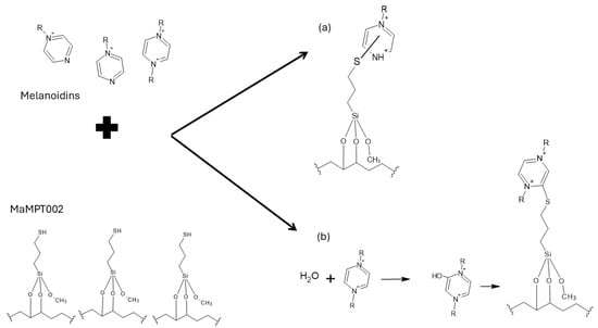 Proposed adsorption mechanism scenarios of color compounds (e.g., melanoidins) from tequila vinasses on the MaMPT002 adsorbent: (a) undefined thioether bond position in pirazinium, and (b) by the thioether bond in 2 ring position [15].