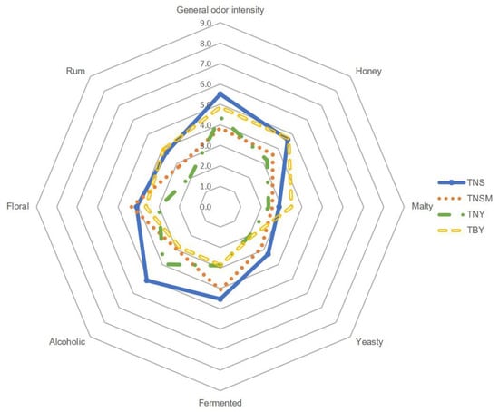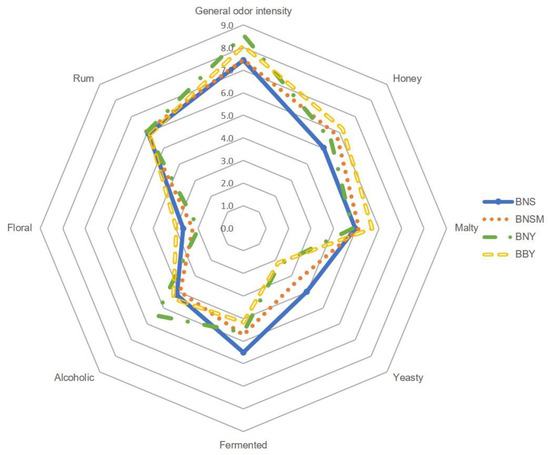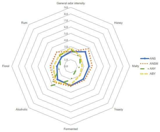 It has been noted that the general odor intensity of meads prepared from the same types of honey was very similar in each group. Evident differences can be noted between meads from different honey sources not only in overall aroma intensity but also in individual descriptors. All buckwheat-based meads (BNS, BNSM, BNY, and BBY) were noted for the highest general odor intensity (from 7.5 to 8.6), followed by tilia-based meads (TNS, TNSM, TNY, and TBY, score range from 3.8 to 5.5). The lowest values for general odor intensity were noted for acacia-based meads (ANS, ANSM, ANY, and ABY) with scores ranging from 2.2 to 2.8. Based on the profile sensory analysis, the buckwheat mead aroma was dominated by such attributes as honey (maximum score 8.6 for BNY), malty (maximum score 6.2 for BBY), rum (maximum score 6.1 for BNSM), fermented (maximum score 5.5 for BNS), and alcoholic (maximum score 5.5 for BNY). Floral and yeasty were slightly less perceptible (maximum scores of 3.0 and 4.0 for BBY and BNS, respectively). On the other hand, the sensation of floral aroma was more pronounced in tilia and acacia meads and exceeded that of rum, which was dominant in buckwheat mead. Considering the effect of wort boiling on the final aroma of the meads, it has been seen that boiling increased the honey and malty sensation, while it decreased the alcoholic aroma sensation. This effect has been observed in buckwheat and linden meads but not so much in acacia. Meads prepared from acacia honey showed greater variability in the aroma caused by the different types of fermentation. As shown in Figure 1, spontaneous fermentation, both with and without G. geotrichum, gave higher scores in honey, malty, and yeasty descriptors. In general, all meads with spontaneous fermentation were characterized by stronger yeasty, fermented, and, in the case of tilia mead, alcoholic aromas. The addition of G. geotrichum during fermentation noticeably increased the floral and rum sensation in acacia mead, floral and fermented in buckwheat mead, and rum, alcoholic, and honey in tilia meads.