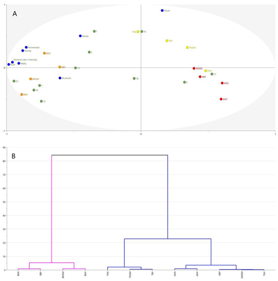Multivariate analysis of odorant concentrations and sensory attributes of meads. The results of the multivariate analysis of important odorant concentrations and sensory attributes of the meads obtained with different technologies. (A) Biplot from principal component analysis (PCA). PC1 and PC2 explain 58% of the variance. Different colors represents different mead samples. (B) Dendrogram from hierarchical analysis. Different colors represents different clusters.