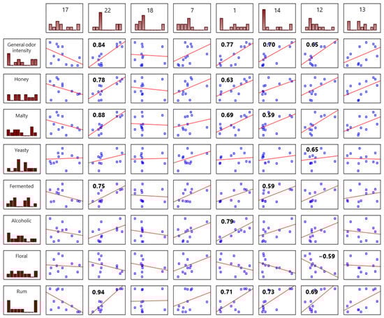 Correlations between odorant concentrations and sensory attributes. The results of correlation analysis between the important odorant concentrations and sensory attributes obtained using the Pearson correlation coefficient test. Exact values are given only for significant correlations (p-value < 0.05).