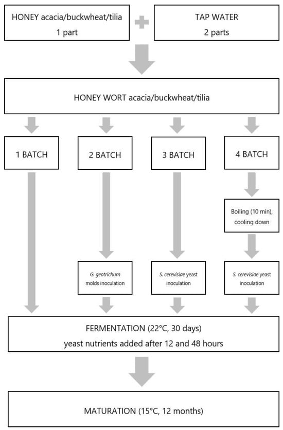 To prepare honey wort, one part of each honey was diluted with two parts of tap water (v/v) to reach 34°Brix. From each honey, four wort batches (2 L each) were prepared: three were not heated and one batch was boiled for 10 min. After cooling the boiled batch to room temperature (around 25 °C), tap water was added to reach 34°Brix. To three unheated batches (one from every type of honey), inoculated G. geotrichum mold was added. To three unheated and three heated batches (two from every type of honey), S. cerevisiae yeast inoculum (1.5 g/L) was added. The last three batches (one from every type of honey) were not inoculated. The production process of all batches is presented in Figure 6. All wort batches were mixed and closed with a fermentation pipe. Diammonium phosphate (DAP) and the commercial nutrient “Kombi Vita” (Browin, Poland) containing diammonium hydrogen phosphate, yeast cell wall components, and thiamine hydrochloride were added to each batch in two equal parts (1 g/L and 1.5 g/L, respectively, in total) after 12 and 48 h of fermentation. Fermentation was carried out at 22 °C for 30 days. After 30 days of fermentation, meads were decanted from the yeast sediment, closed with fermentation pipes, and kept at 15 °C for 12 months for maturation. Decanting from the sediment was repeated at 3 and 6 months of maturation. Labeling of the samples was set to include honey and fermentation type and heating/not heating of the wort. All sample labels together with a precise description of the parameters used are shown in Table 5.