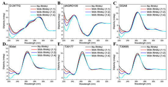 In order to understand the interactions between RHAU and various G4 dimers, CD measurements were also performed on G4+RHAU mixtures at different ratios. In our previous work [42], it was reported that RHAU has no CD signals from 220 nm to 330 nm because of the negligible absorption of Trp and Tyr residues in RHAU [43]. Therefore, differences in CD signals observed before and after RHAU addition were entirely assigned to structural changes in G4 dimers induced by RHAU. For D-24TTG (Figure 1A), as the amount of RHAU increased, its positive peaks at 267 nm and 295 nm showed a slight blue-shift along with an enhanced signal at 267 nm. This phenomenon indicated that the parallel elements of hybrid D-24TTG gradually increased. It is reported that when ligands induce hybrid D-24TTG G4 to transform to parallel structures, its positive peak at 267 nm is evidently enhanced, the positive peak at 295 nm is weakened, and the negative peak at 238 nm is also weakened, accompanied by a position shift to 242 nm [27]. However, in this work, although the CD signals of D-24TTG changed to some extent after the addition of RHAU, these changes were quite small and the negative peak at 238 nm did not move to a higher wavelength but moved to a lower wavelength. These differences demonstrated that D-24TTG here did not transform into a parallel conformation and was still a hybrid conformation. With regard to dAGRO100 and GGA8, as exhibited in Figure 1B,C, only when the ratio of G4:RHAU reached 1:4 were their signals at 275 nm and 265 nm weakened slightly and red-shifted, meaning that RHAU had a weak effect on these two dimers. With respect to 93del, T30177, and T30695, as shown in Figure 1D–F, RHAU had a slight impact on their CD signals. Specifically, when the G4:RHAU ratio changed from 1:0 to 1:2, the signals at 265 nm of these three dimers gradually decreased, with no new signals appearing at other wavelengths, pointing out that RHAU only affected G-tetrad stacking without causing structural transformation. When the ratio changed from 1:2 to 1:4, there were no further changes in the CD signals of these three G4s, meaning that their structures reached a stable state at a 1:2 ratio. Further comparison demonstrated that in the presence of RHAU, changes in the CD signals of 93del and T30695 were similar to each other, while the signal intensity of T30177 decreased more evidently. Differences in the attenuation amplitudes of the characteristic peaks of each G4 dimer reflected distinct interactions between RHAU and different G4 dimers, even though no apparent changes in CD signals were observed for all G4 dimers in the presence of RHAU, emphasizing that the main structure of each dimer was maintained, which was beneficial for the analysis of subsequent experimental results.