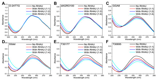 We also carried out UV–Vis detections on G4+RHAU mixtures at different ratios (Figure 2) to understand the interactions between RHAU and these G4 dimers. Studies show that DNAs have the maximum absorption at 260 nm, and changes in DNA structures lead to hypochromicity and red shifts of UV–Vis spectra [44]. Therefore, UV–Vis analysis can also be used to examine the influence of external factors on nucleic acid structures. In our previous work, RHAU only had UV–Vis absorption below 240 nm [42], so the observed changes in UV absorbance at 260 nm were entirely attributable to structural changes in G4s induced by RHAU. As presented in Figure 2A, RHAU showed a negligible effect on the UV–Vis spectrum of D-24TTG at any G4:RHAU ratio, which meant that RHAU showed no apparent interference in the structure of D-24TTG, consistent with CD results. For dAGRO100 (Figure 2B), only when the G4:RHAU ratio was 1:4 did its UV–Vis absorbance decrease obviously, in agreement with the CD results in Figure 1B. A slight hypochromic effect occurred after RHAU addition, but no position shift of signals was observed, indicating that the influence of RHAU on the dAGRO100 G4 structure was reflected in the enhancement of the stacking of G-tetrads [45]. As illustrated in Figure 2C–F, compared to dAGRO100, the UV–Vis absorptions of GGA8, 93del, T30177, and T30695 displayed a more apparent hypochromic effect with an increase in RHAU, pointing out that RHAU caused more enhancement of the stacking of G-tetrads of these four dimers. Differences in the hypochromic effects observed for each dimer revealed that RHAU had different impacts on the G-tetrad stacking of these six G4 dimers.