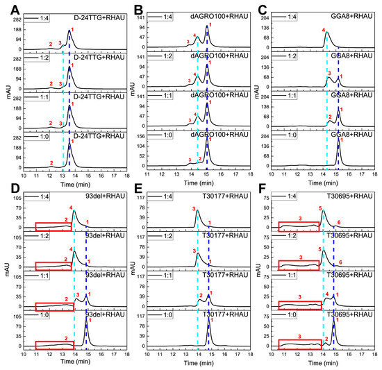 SEC chromatograms of G4 dimers with RHAU at different molar ratios: (A) D-24TTG, (B) dAGRO100, (C) GGA8, (D) 93del, (E) T30177, and (F) T30695. Ratios: 1:0, 1:1, 1:2, and 1:4. Chromatograms were obtained under isocratic mode at a rate of 0.5 mL min−1 on a TSKgel G2000SWXL column (7.8 × 300 mm i.d.) with 50 mM KH2PO4 (pH 7.0) as the mobile phase. The concentration of G4s was 10 μM. The column temperature was maintained at 30 °C, and the detection wavelength was 260 nm.