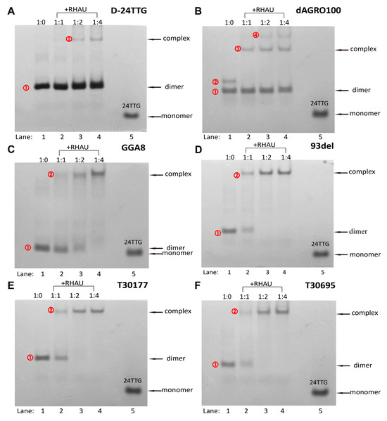 Native-PAGE images of different G4 dimers without and with RHAU at different molar ratios: (A) D-24TTG, (B) dAGRO100, (C) GGA8, (D) 93del, (E) T30177, and (F) T30695. Lanes 1–4: the molar ratios of G4:RHAU were 1:0, 1:1, 1:2, and 1:4.