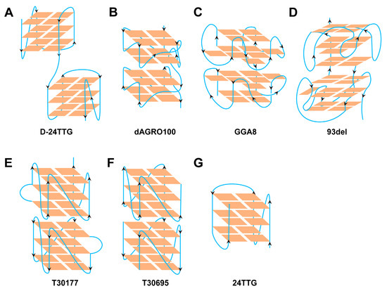 - Matsugami, A.; Okuizumi, T.; Uesugi, S.; Katahira, M. Intramolecular higher order packing of parallel quadruplexes comprising a G:G:G:G tetrad and a G(:A):G(:A):G(:A):G heptad of GGA triplet repeat DNA. J. Biol. Chem. 2003, 278, 28147–28153. [Google Scholar] [CrossRef]