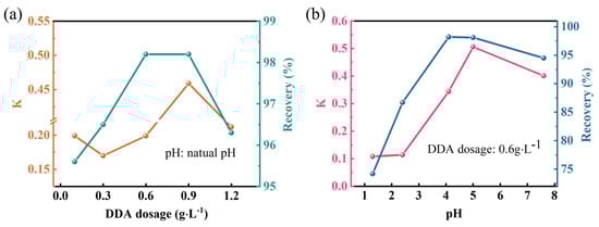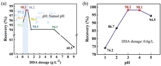 Experimental results of DWSSS flotation: (a) recovery of silicon under different DDA dosages; and (b) recovery of silicon under different pH levels.