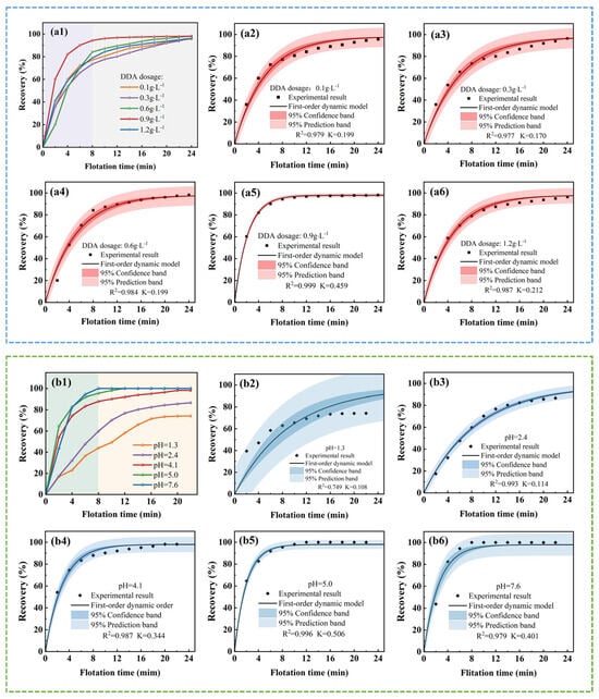 The fitting results of the first-order classical flotation rate model for silicon recovery with different conditions: (a1) the recovery of silicon under different DDA dosages; (a2–a6) the fitting results under different DDA dosages; (b1) the recovery of silicon under different pH levels; and (b2–b6) the fitting results under different pH levels.