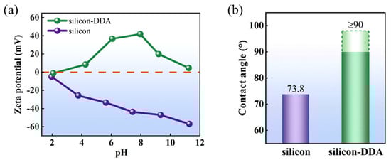 (a) Effect of DDA on surface zeta potential of silicon; (b) contact angle of silicon before and after DDA addition.