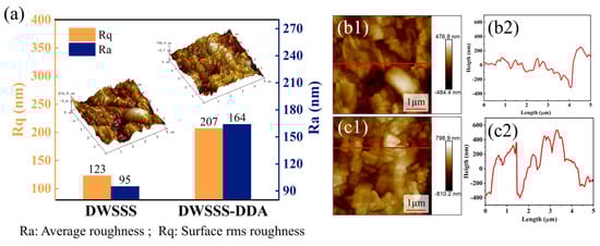 (a) Three-dimensional height morphology and roughness changes in DWSSS before and after DDA addition; (b1,b2) two-dimensional geometric morphology and cross-sectional height of DWSSS; (c1,c2) two-dimensional geometric morphology and cross-sectional height of DWSSS-DDA.