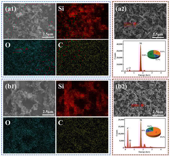 The surface morphology of the DWSSS is shown in Figure 8(a1). It can be seen from Figure 8(a2) that the silicon particles in DWSSS and DWSSS–DDA are light gray and mainly composed of Si, O, and C, where the main elements are silicon and carbon, with a silicon content of 52.8% and a carbon content of 33.5%. The surface morphology of the DWSSS–DDA is shown in Figure 8(b1); the carbon content in DWSSS–DDA is 69.4%, and the silicon content is 14.6%, as shown in Figure 8(b2). The significant increase of carbon content indicates that DDA has adsorbed in the silicon surface of the DWSSS after the addition of DDA.