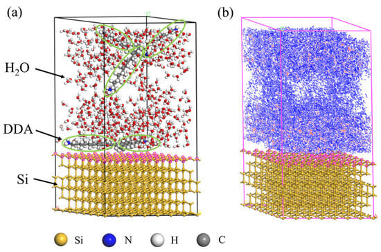 The Adsorption Locator module is used to locate the adsorption position of DDA molecule on the Si surface. To test the adsorption positions of DDA molecules in an aqueous solution system with Si, an adsorption substrate was established with a Si (111) crystal plane cut to a thickness of 6 Å, a supercell of 7 × 7, and a vacuum layer thickness of 40 Å. The adsorbates consisted of 5 DDA molecules and 500 H2O molecules. The calculation results are shown in Figure 9, where Figure 9a presents the optimal adsorption configuration, the green circle is the location of five DDA molecules. It can be seen from the optimal adsorption configuration that DDA, as a macromolecule, has multiple adsorption sites on Si (Top site, Bridge site). The test results indicate that DDA is more inclined to adsorb horizontally on the Si surface. Figure 9b illustrates the most likely adsorption positions of DDA on the Si surface, with the red positions indicating the locations where adsorption is most likely to occur.