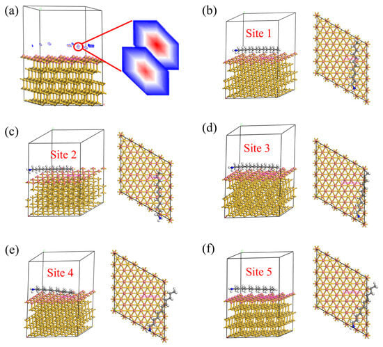 In order to further test the adsorption position of DDA on the Si (111) surface, an adsorption substrate is established, and the Si unit cell is cut to obtain the (111) crystal plane, with a surface layer cutting thickness of 4 Å. A supercell of 5 × 5 is created, and the vacuum layer thickness is set to 15 Å. The adsorbate is a single DDA molecule. The calculation results are shown in Figure 10. The analysis of the adsorption positions of Si (111) and DDA is illustrated in Figure 10a, with the most probable adsorption position marked in red. The stereoscopic and top views of the five positions where Si (111) and DDA are most likely to adsorb are shown in Figure 10b–e, and the DDA molecules adsorbed on Si are macromolecules, and there are many adsorption sites (Top site and Bridge site). The adsorption energy of five different adsorption sites is shown in Table 1. It can be seen that the adsorption reaction between Si (111) and DDA can occur spontaneously, the energy is low, and the adsorption model is stable.