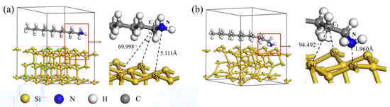 Through DFT calculations, the interfacial adsorption behavior between DDA and silicon in the DWSSS is further revealed from a microscopic perspective. The adsorption site of DDA on Si is the bridge site. A Si-DDA model was established with a Si (111) surface layer thickness of 3 Å, a supercell of 3 × 3, and a vacuum layer thickness of 10 Å to explore the adsorption pathway of Si and DDA. The established adsorption model is shown in Figure 11a. The model underwent geometric structure optimization, and the optimized model is shown in Figure 11b. It can be seen that the positions of the atoms in the adsorption model changed after geometric optimization, and the optimized model was used for DFT calculations involving Si atoms and DDA molecules.