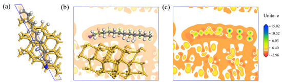 After the adsorption process of the Si-DDA system, the differential charge density map was taken from the plane that intersects the maximum number of atoms, as shown in Figure 12a. The differential charge density maps are illustrated in Figure 12b,c. It can be qualitatively analyzed that after DDA is adsorbed on Si, the charge of the H atoms on DDA increases, while the C atoms, N atoms, and the Si atoms lose charge.