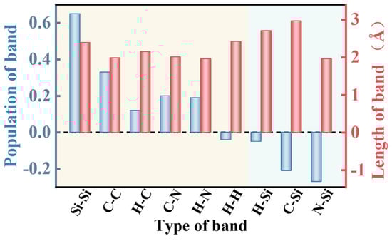 The Mulliken population distribution of various chemical bonds after Si and DDA adsorption is shown in Figure 13. It can be observed that the population of Si-Si bonds, C-C bonds, H-C bonds, C-N bonds, and N-Si bonds are all greater than 0. However, the population of H-H bonds, H-Si bonds and C-Si bonds are all less than 0, indicating that H-H bonds, H-Si bonds, and C-Si bonds cannot be formed. By comparing the bond lengths, it can be concluded that the H-N bond with a bond length of 1.96 Å is the shortest among the chemical bonds formed, indicating the strongest covalent bond strength for the H-N bond in DDA.
