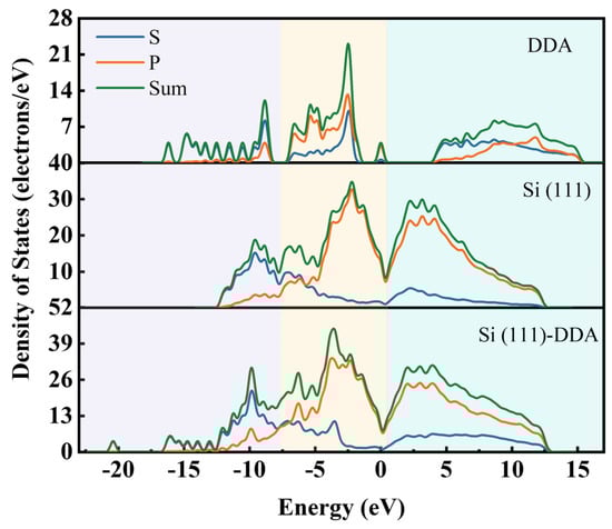 The band structure and density of states of the DDA and Si (111) surface before and after DDA adsorption were analyzed to reveal the distribution of the electronic states of Si and DDA during the adsorption process. The density of state distribution is shown in Figure 14. The density of states is divided into three valence bands with the upper valence band located at 0.4~17 eV, the middle valence band located at 0.4~−7.5 eV, and the lower valence band located at −7.5~−23 eV before and after DDA adsorption on the Si (111) surface. The upper valence band at 0.4~17 eV and the middle valence band at 0.4~−7.5 eV are mainly contributed by the P orbitals of the silicon atoms. In contrast, the S orbitals of the DDA atoms mainly contribute to the lower valence band at −7.5~−23 eV.
