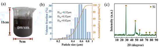 (a) Image of original DWSSS; (b) particle size distribution of DWSSS; (c) XRD phase analysis result of DWSSS.