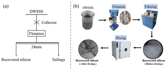 The flotation experiment was carried out with an XFDIV flotation machine, and the experimental process is shown in Figure 16a,b. The flotation experimental procedure is as follows: (1) 400 mL of DWSSS is placed into a 500 mL flotation cell, then water is added to the flotation cell to maintain the total volume of the slurry at 500 mL; (2) the impeller speed is set at 1920 r·min−1 in the flotation process; (3) the DWSSS is stirred in the flotation cell for 2 min to obtain a homogeneous flotation slurry, then the collector is added to the slurry and stirred for 3 min; (4) air is pumped into the flotation cell at 200–300 L/h; (5) once the air is turned on, twelve two-minute concentrates are collected by scraping the froth every five second, a total flotation time of 24 min; and (6) the recovered silicon concentration and tailings are filtered and then dried at 80 °C until a constant weight is maintained. The recovery of the silicon was calculated by weighing, and the samples were then characterized and analyzed.